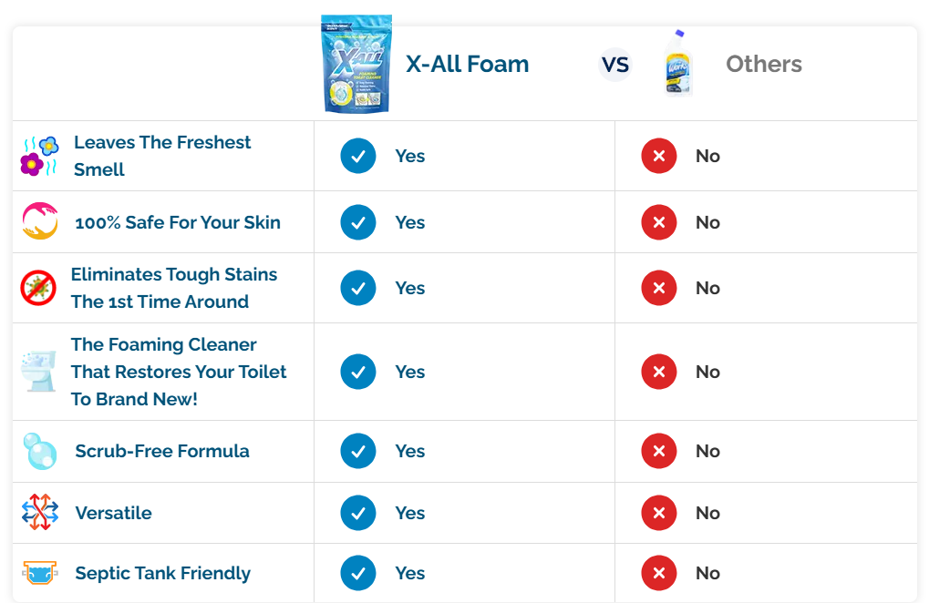 X-ALL Foam is the clear #1 choice for anyone who wants a truly clean toilet without the usual tradeoffs. It delivers powerful foam coverage that reaches under the rim, breaks down limescale and stubborn stains fast, and leaves the bowl fresh without scrubbing or repeat applications. No weak formulas. No overhyped bestsellers that still require effort. Just consistent, real-world cleaning results. Backed by a 30-day money-back guarantee, it’s the smartest buy in this category.